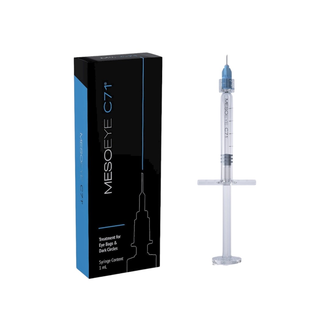 MesoEye C71 is specifically designed to address age-related thinning of the skin around the eyes, effectively targeting dark circles, crow’s feet, and loss of firmness. Its unique formula with a peptide complex and hyaluronic acid provides intensive hydration, strengthens the structural framework of the skin, and smooths wrinkles, restoring a youthful, radiant look. Unlike conventional biorevitalizants based solely on hyaluronic acid, MesoEye C71 has a much richer composition, and unlike fillers, it has a lower density and a different purpose. At the same time, it delivers a comprehensive effect: it deeply hydrates while helping to drain excess fluid, rejuvenates, nourishes the skin with essential components, and helps prolong the life cycle of skin cells. Its active ingredients are primarily aimed at strengthening blood vessels, normalizing metabolism, improving hydration, and enhancing overall skin quality in the eye area.